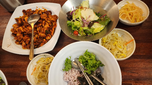 샐러드와 콩나물, 채나물이 나오고 나서 주꾸미도 동시에 테이블로 나왔다. 우리 테이블은 직원분이 세팅해 주셨는데 로봇친구도 홀을 왔다 갔다 하며 도움을 주고 있었다. 요즘에는 로봇친구들은 아주 흔하게 볼 수 있고 월 100만 원으로 로봇을 사용하는데 바쁠 때 아주 유용하다고 들었다. 이제는 친숙한 로봇 친구라서 더 이상의 리뷰에 로봇이야기는 하지 않겠다. 주꾸미는 기본 맛으로 선택하였기에 맵지 않고 간이 딱 맞으며 같이 나온 밥에 올려 비벼 먹기 딱 좋았다. 콩나물과 채나물을 넣어 같이 비벼 먹으면 매우 만족스러운 식감이 완성되며 아삭하고 쫄깃한 맛에 입안이 황홀해진다. 이때 샐러드의 새콤함으로 개운하게 입을 헹구면 다시 매운 주꾸미가 당긴다. 주꾸미와 함께 고르곤졸라 피자가 나왔는데 피자맛집이라 해도 과언이 아닐 만큼 피자의 크기도 크고 맛도 달콤하며 고소했다. 씬두께이고 크기도 딱 좋은 사이즈인데 반으로 접어서 한입 베어 물면 고소함과 달콤함이 입안으로 쏟아진다. 몇 번 씹지도 않았는데 금방 녹아 없어지는 고르곤 졸라 피자 였고 다들 식기 전에 맛있게 먹어야 한다는 생각으로 급히 먹다 보니 내가 주꾸미를 한 수저 먹는 사이 피자는 없어져 버렸다.